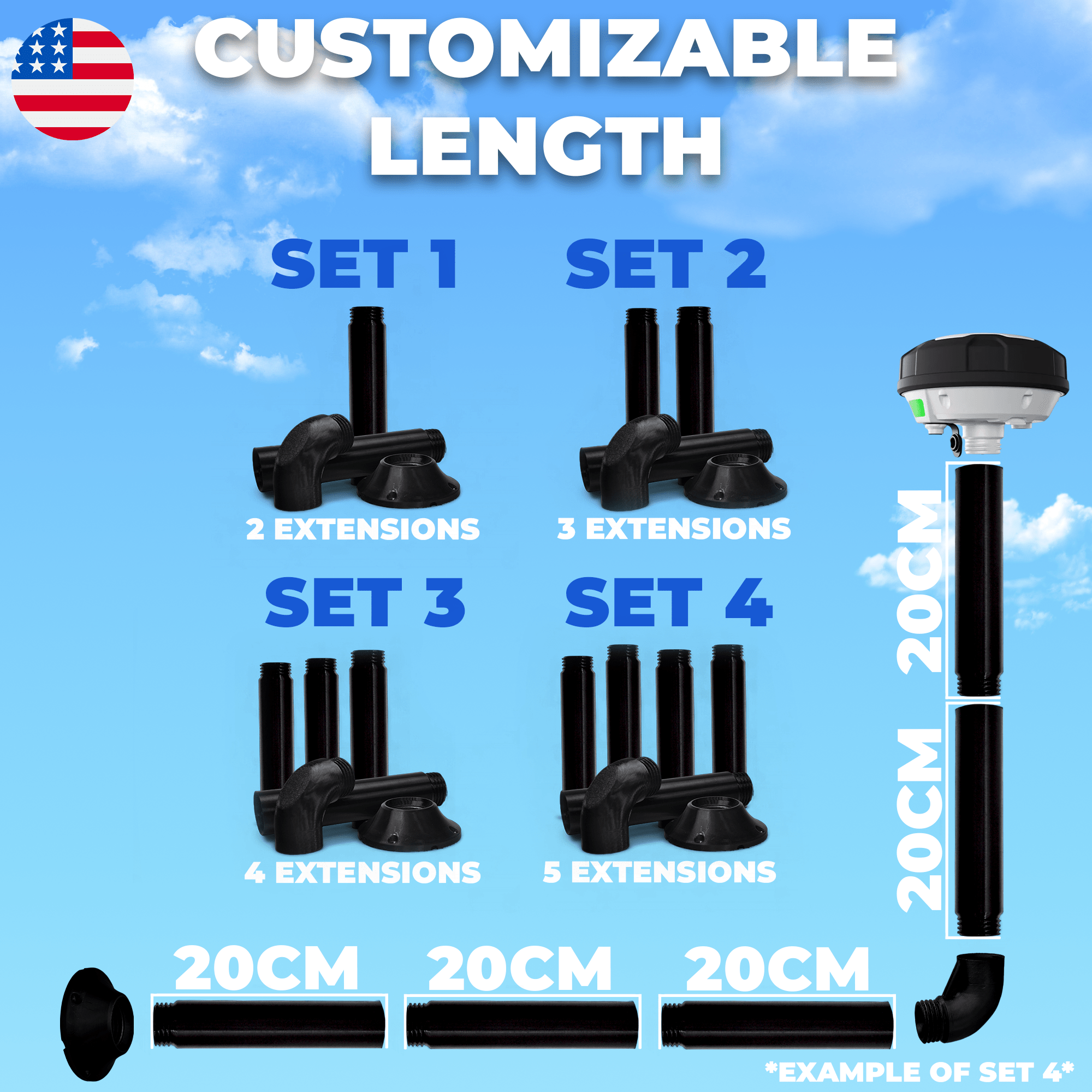 Vsak podaljšek meri 20 cm (7.87") in se privije eden na drugega, kar omogoča prilagoditev višine in usmeritve – vodoravno, navpično ali v poljubnih konfiguracijah.